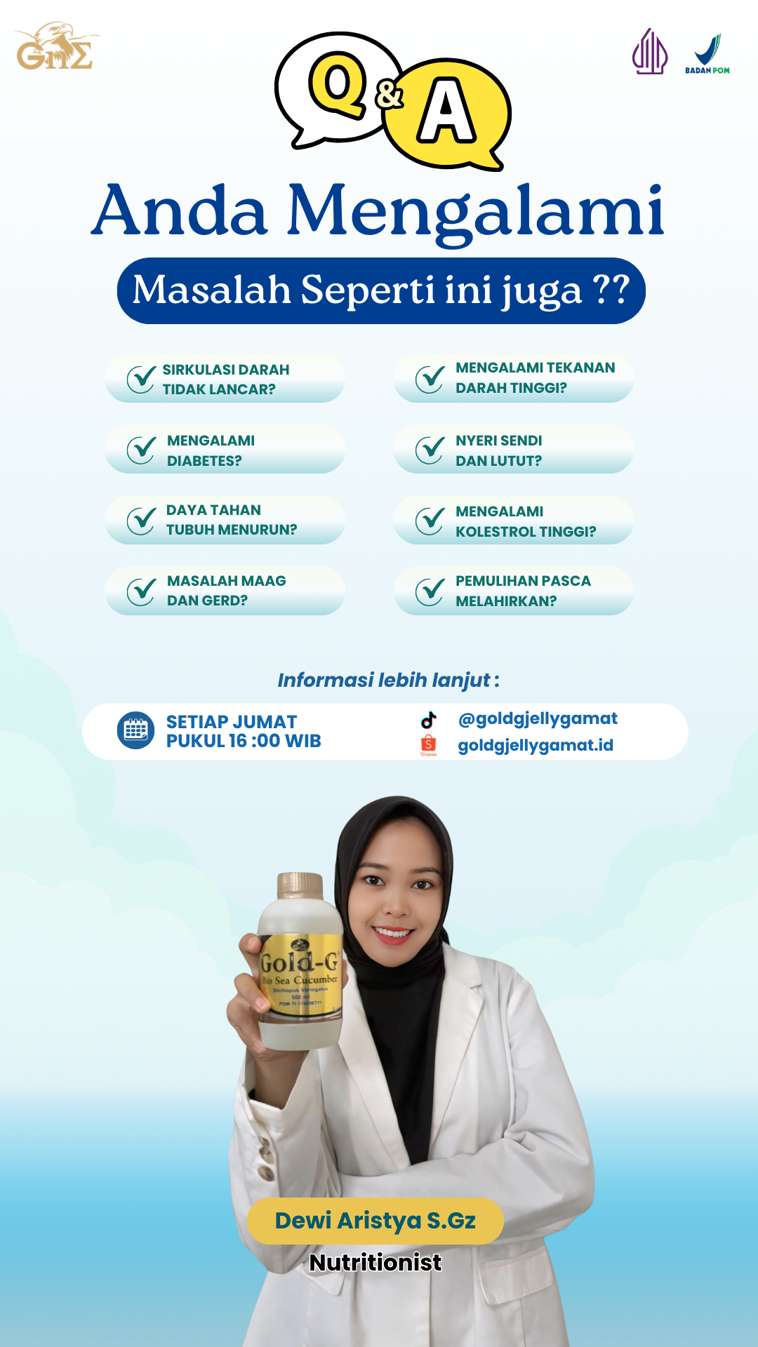 Gold-G® Bio Sea Cucumber Jelly (Jelly Gamat) Suplemen kesehatan premium dengan ekstrak teripang murni dari spesies Stichopus Variegatus. Diformulasikan dengan teknologi ekstraksi modern untuk menjaga nutrisi dan efektivitasnya, mendukung kesehatan sendi, jantung, kulit, dan pencernaan, diproduksi dengan standar internasional, serta dipercaya lebih dari 23 tahun dengan jutaan pelanggan di Malaysia, Indonesia, dan Singapura.