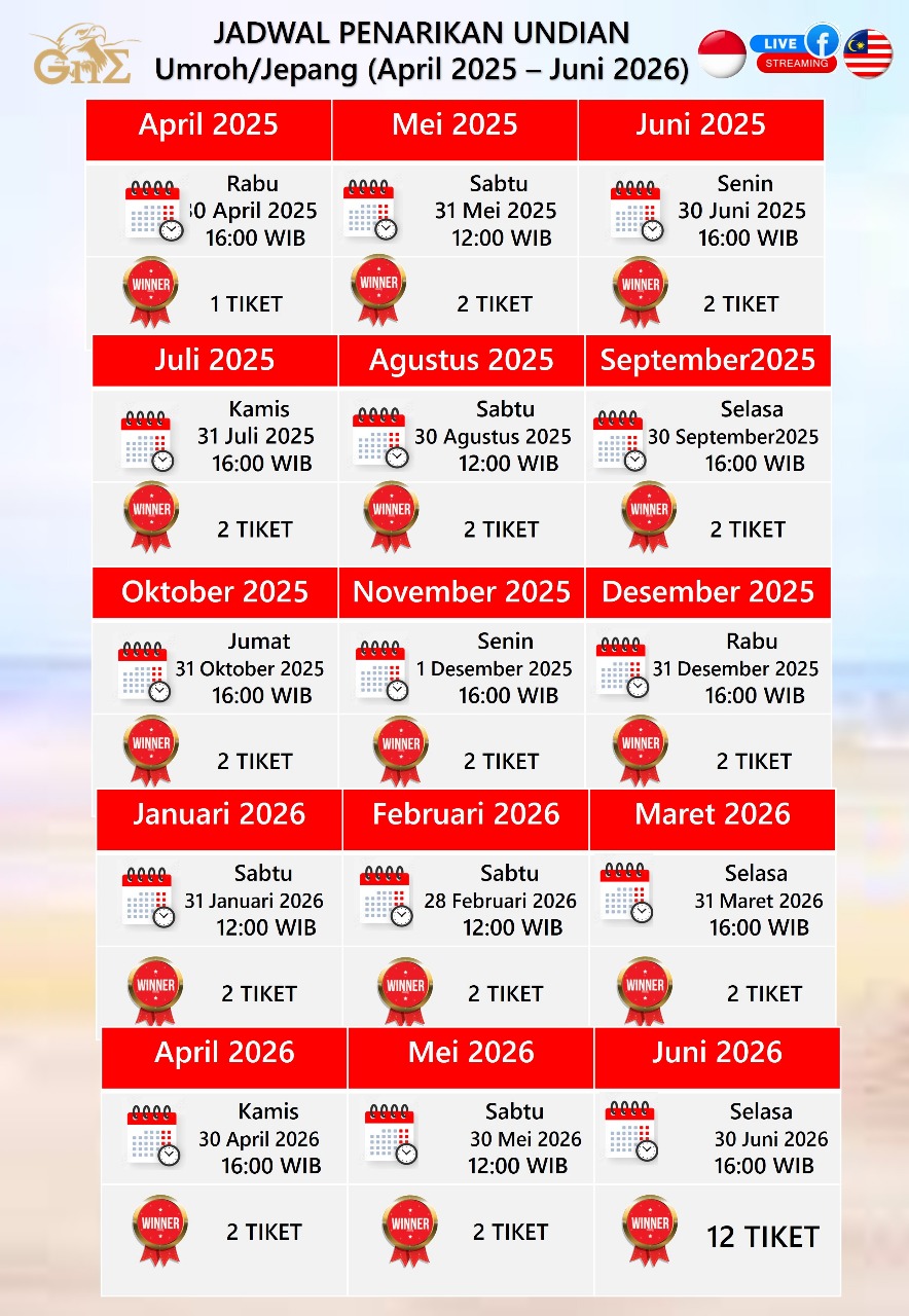 Menangkan perjalanan Ibadah Umroh untuk 35 pemenang! Daftar sekarang dan raih kesempatan langka ini menuju Tanah Suci.